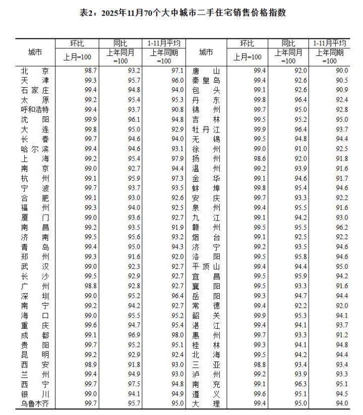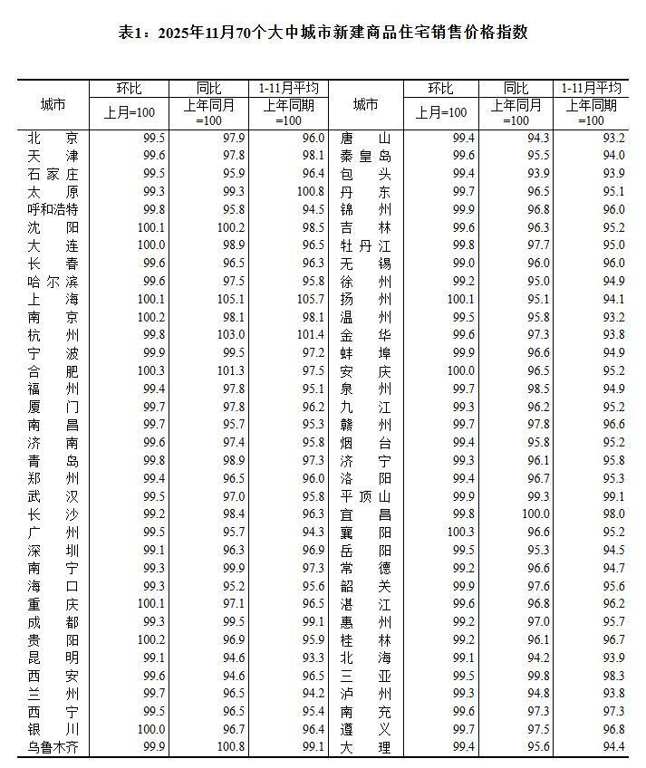 12月15日,国家统计局城市司首席统计师王中华解读商品住宅销售价格变动情况统计数据,2025年11月份,70个大中城市商品住宅销售价格环比总体下降、同比降幅扩大。